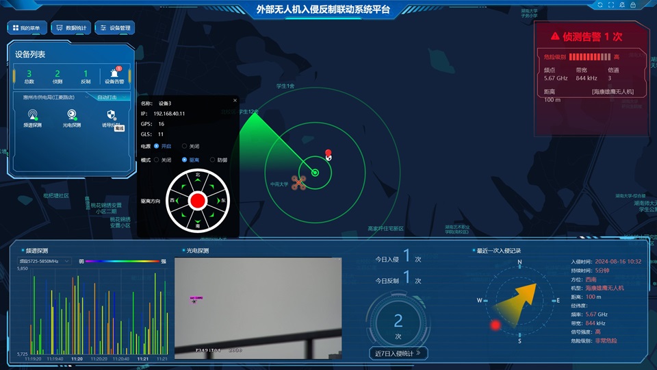 外部無人機(jī)入侵反制聯(lián)動(dòng)系統(tǒng)平臺(tái),通過獲取前端無人機(jī)探測設(shè)備和無人機(jī)反制設(shè)備的數(shù)據(jù),展示實(shí)時(shí)視頻畫面、設(shè)備分布、設(shè)備管理、告警界面以及無人機(jī)信息等,并采用GPS定位誘騙方式的反制技術(shù),誤導(dǎo)非法入侵無人機(jī)。為變電站圍墻內(nèi)外建立一道隱形的、可靠的“無人機(jī)隔離墻”,有效提高電力設(shè)備的安全性,保障電網(wǎng)設(shè)備安全穩(wěn)定運(yùn)行。