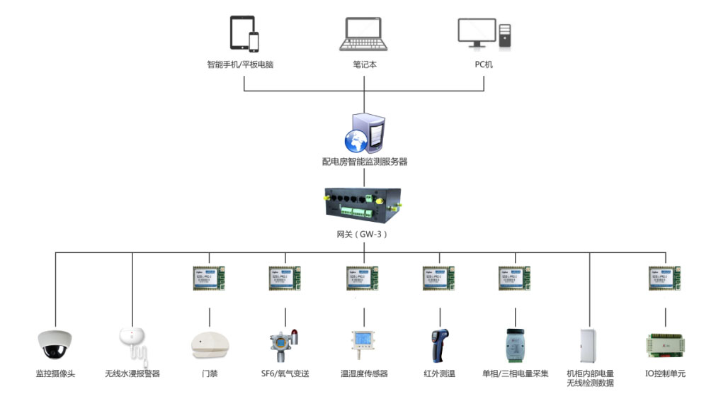 在機房各區(qū)域安裝無線煙霧傳感器,對火情進行采集并上傳至中心。